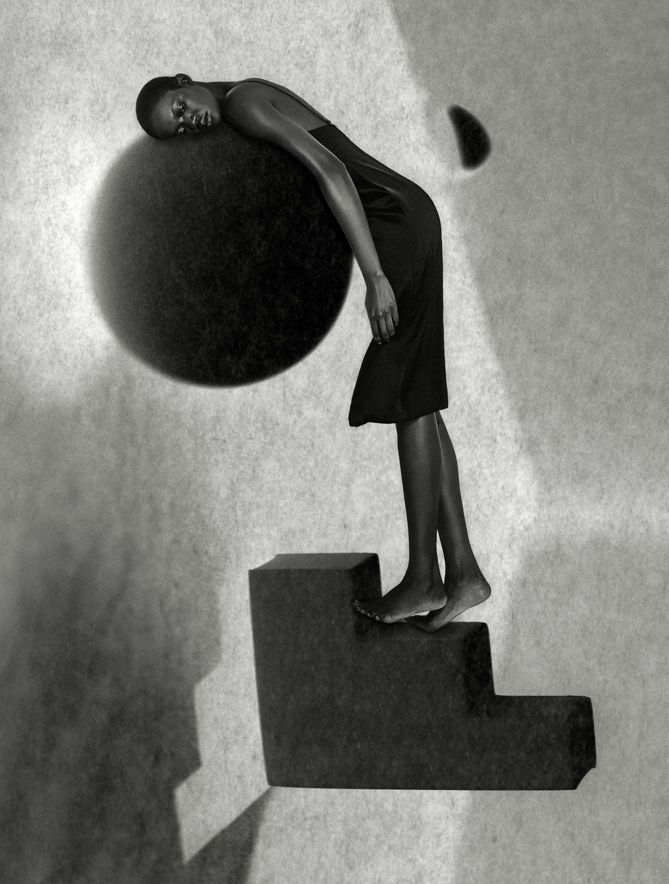 Hart is known for her use of black-and-white tones, silhouettes, and the contrast of light and shadow. Her work creates a sense of stepping into an unreal space, where abstract shapes and lighting are the focus.